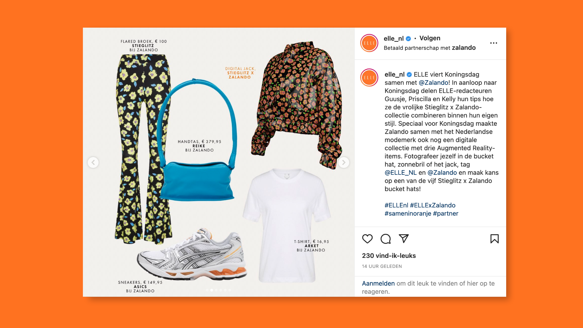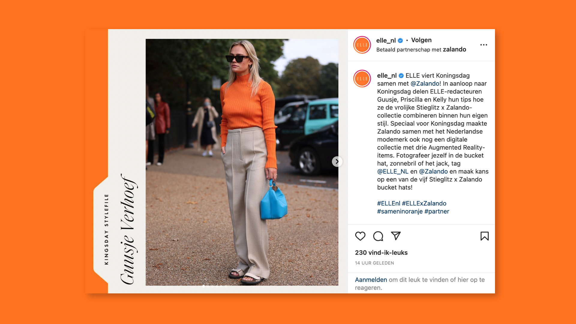 With this initiative, Zalando provided everyone on social media with the opportunity to share the orange feeling and contribute to the sense of belonging. The campaign was promoted on Zalando’s own channels and supported by various media partners (Elle Magazine, RTL Boulevard, 538 Koningsdag festival) and influencers. Resulting in a total of 2.100.000 views and 1.200.000 engagements.